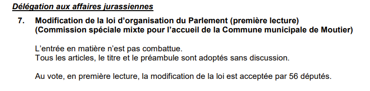 La modification de la Loi d’organisation du Parlement jurassien prévoyant la création d’une commission spéciale mixte pour l’accueil de la Commune municipale de Moutier a été acceptée quasi unanimement en première lecture lors de la séance plénière du 16 février 2022. A partir de cette date, la mise sur pied de ladite commission pouvait être préparée, si elle ne l’avait déjà été auparavant, afin d’avancer dans ce dossier. Depuis lors, plus de deux mois se sont écoulés. La deuxième lecture, le 30 mars 2022, n’a réservé aucune surprise.