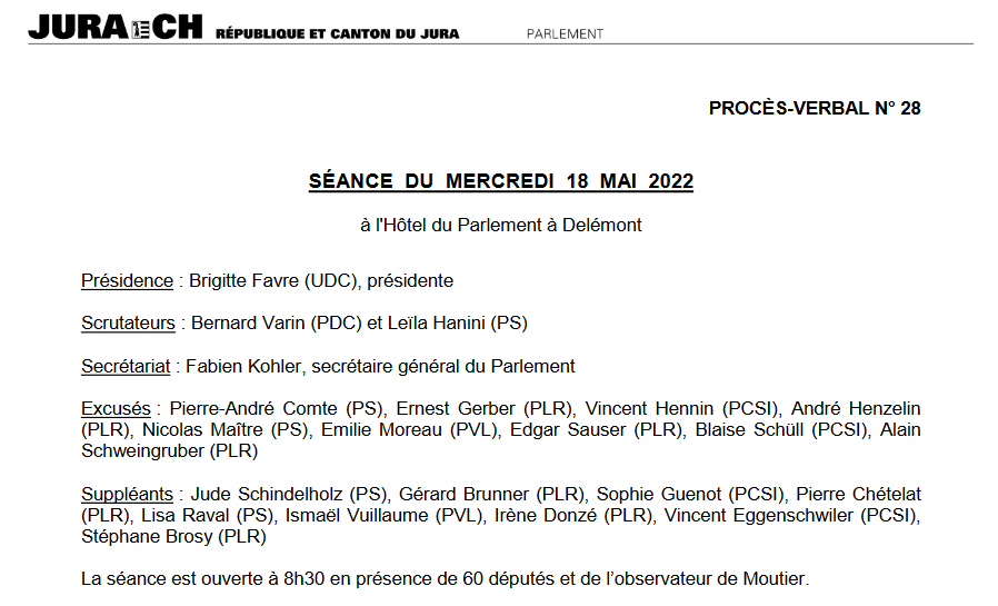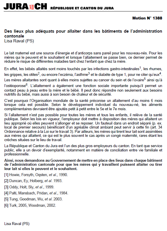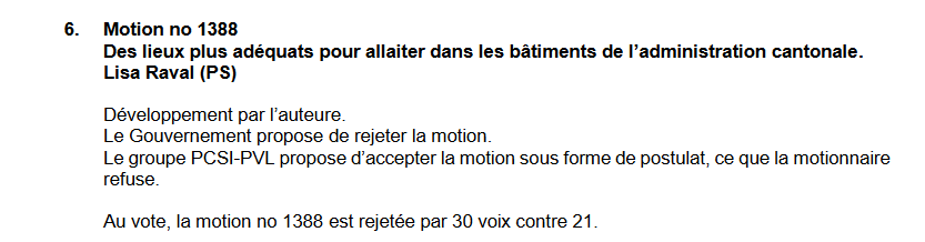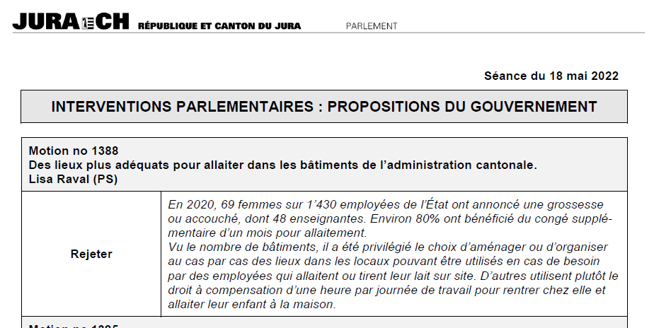 La motion N° 1388 de la députée suppléante Lisa Raval « Des lieux plus adéquats pour allaiter dans les bâtiments de l’administration cantonale » a obtenu, lors de la séance plénière du Parlement jurassien du 18 mai 2022, 30 non, 21 oui et 7 abstentions.